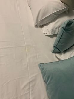Mehrere eklige Flecken unbekannter Herkunft außerdem kurze schwarze harre auf dem Bett