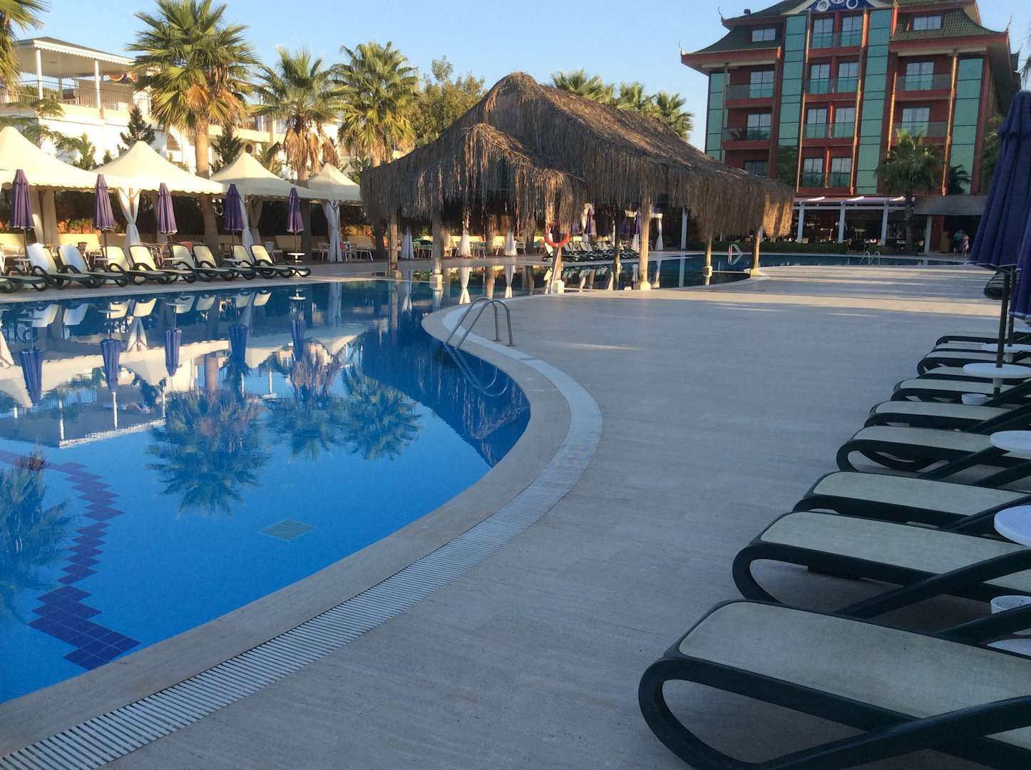 Pool vor dem Restaurant mit Regendusche aus dem Schilfdach