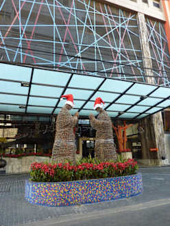 Auch im Siam ist Weihnachten, überall und an jeder Ecke stehen kunstvolle Weihnachtsbäume oder wie auf dem Bild zu sehen, vor dem Eingang mit roter Zipfelmütze.