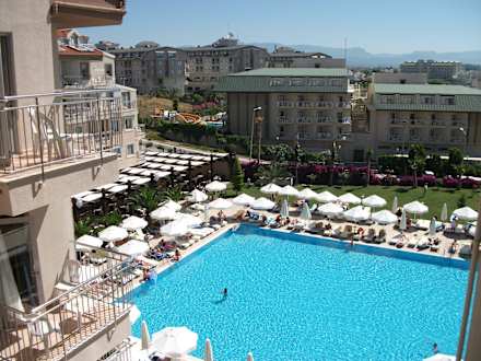 Blick vom Zimmer auf Pool und Restaurant unten