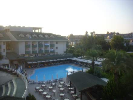 Blick vom Balkon auf 1 Pool von 3 Pools