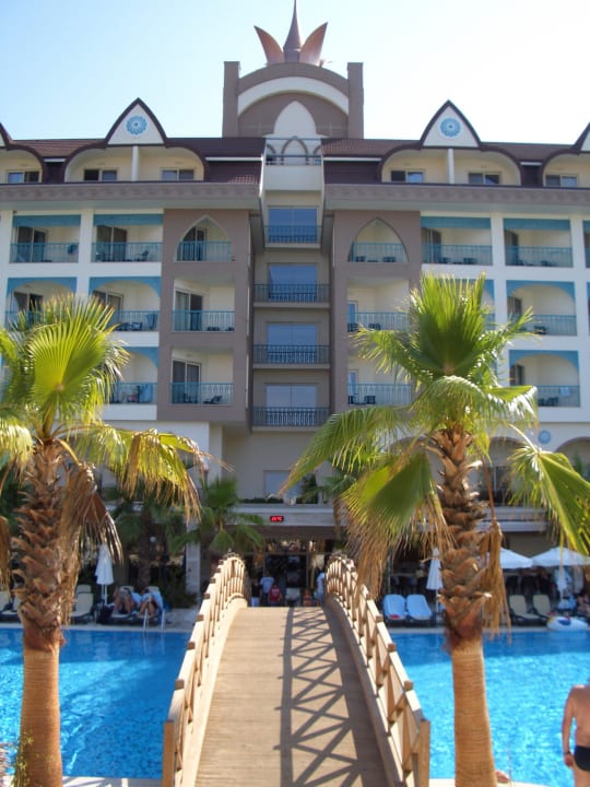 Blick vom Shuttlebus auf Pool und Hotel