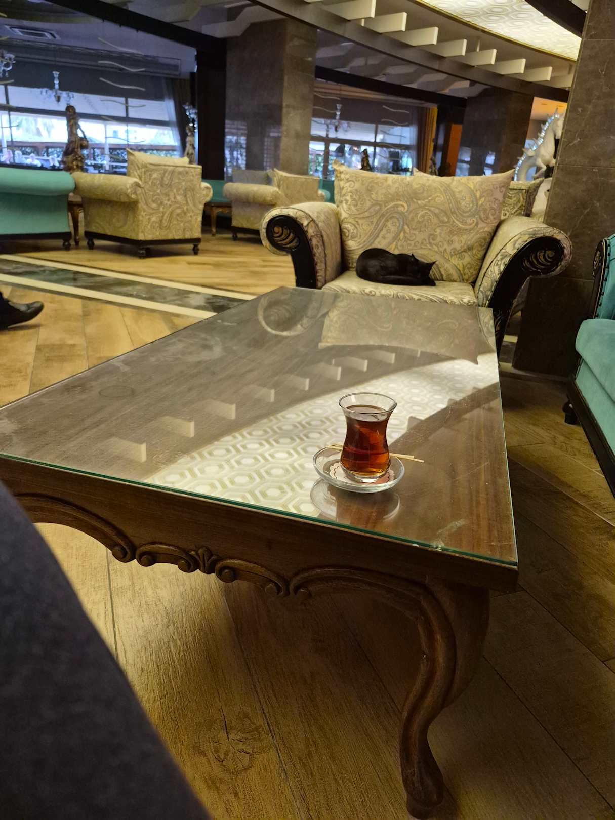 Sitzbereich Lobby. Oft dunkel. Licht war sehr häufig ausgeschaltet. Wurde sogar ausgeschaltet während man dort saß bzw. als viele wegen des Wetters drinnen saßen. Dadurch sehr Dunkel & uneinladent. Sauberkeit eher mittelmäßig.