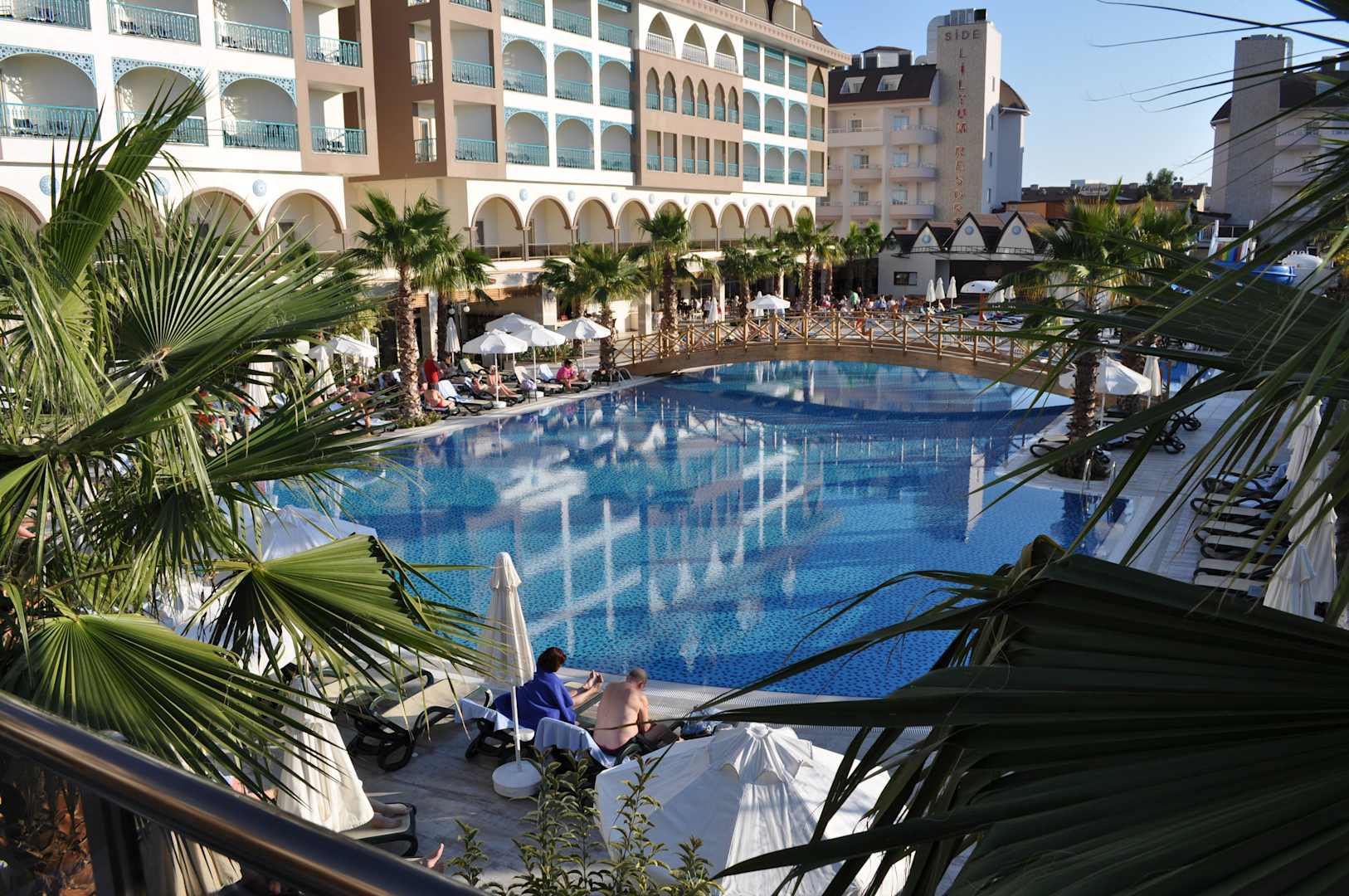 Blick von der Terrasse zur Poolanlage