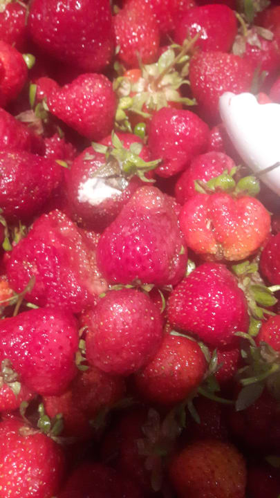 Schöner Schimmel an den Erdbeeren! Das überträgt sich ja natürlich auch nicht auf die anderen Erdbeeren! :-) Lecker Schmecker. So muss das in einem 5-Sterne Hotel sein!!! :-) TRAURIG!!!!