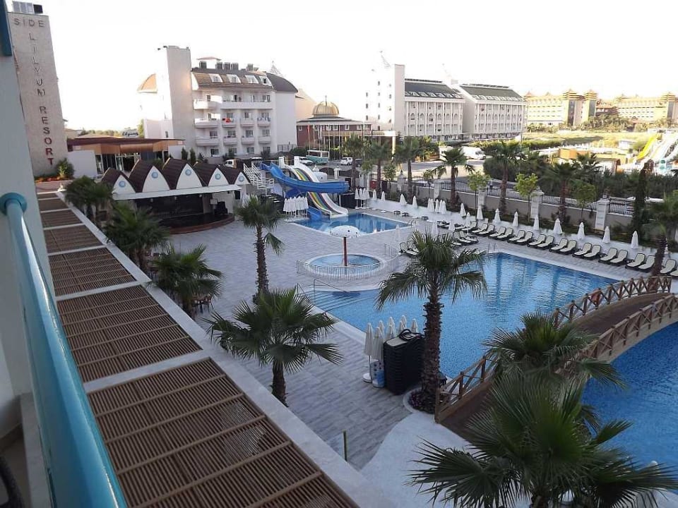Blick auf den Pool vom Balkon