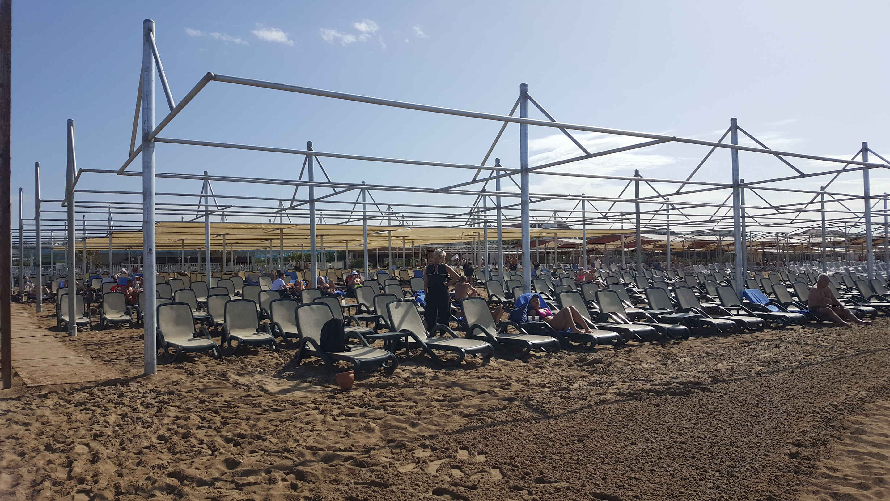 Strand Liegen, hinten Strandbar