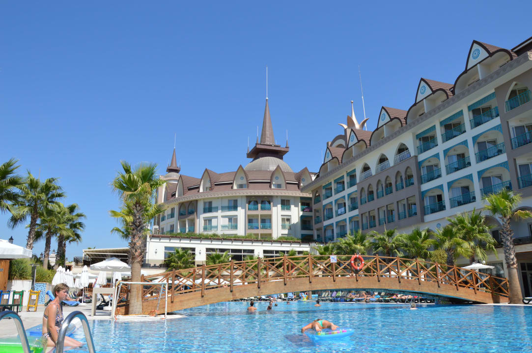 Blick vom Pool auf das Hauptgebäude