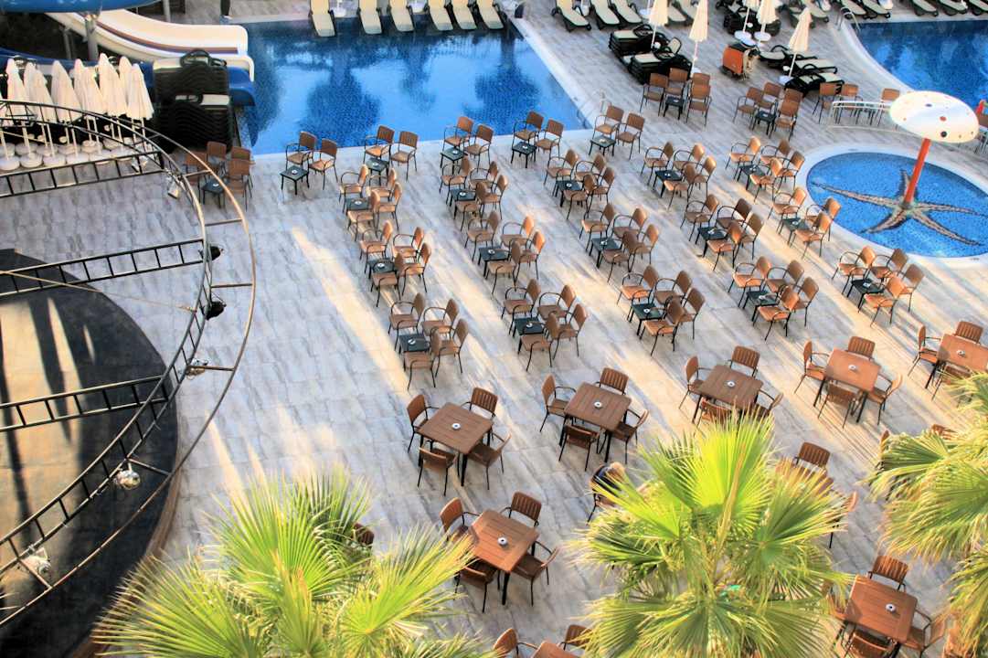 links die Bühne, davor die Sitzplätze der Poolbar, tagsüber stehen auch dort Liegen.