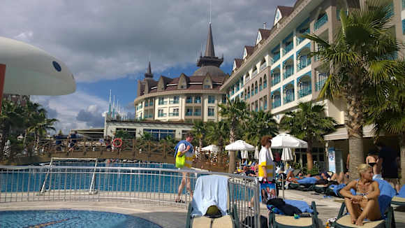 Blick vom Pool auf das Hotel