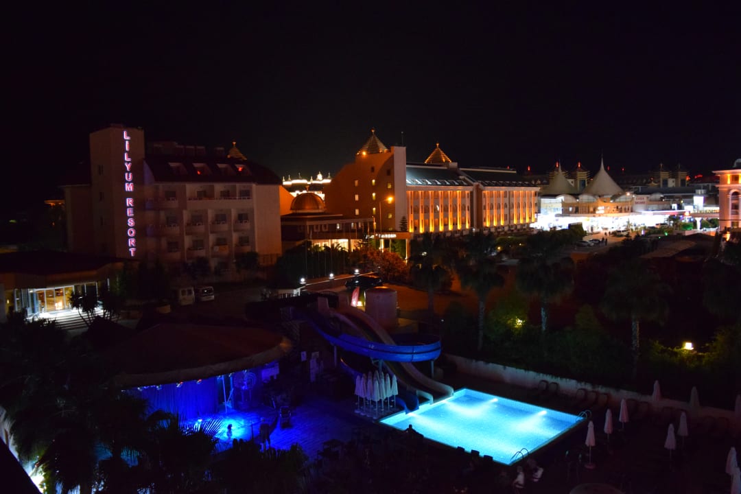 Ausblick vom Balkon auf die benachbarten Hotels und den Pool bei Nacht.