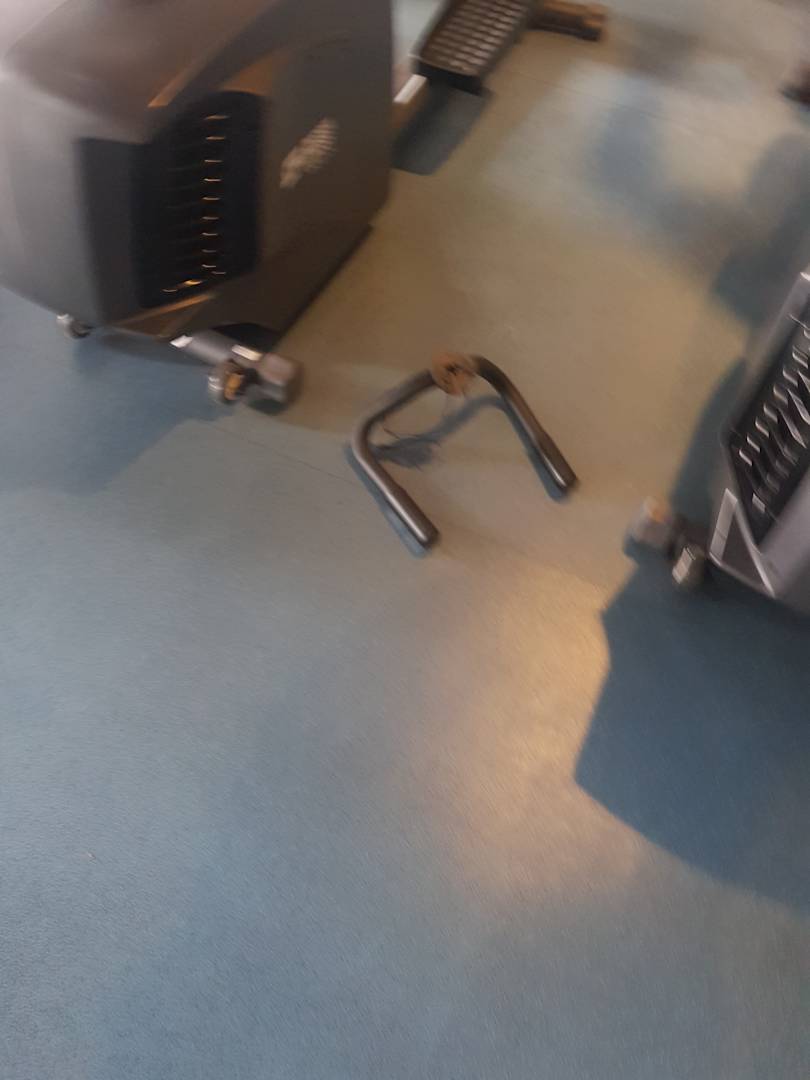 Fitnessstudio abgefallen Teile vom Crosstrainer die im Studio herum liegen.Ein no go