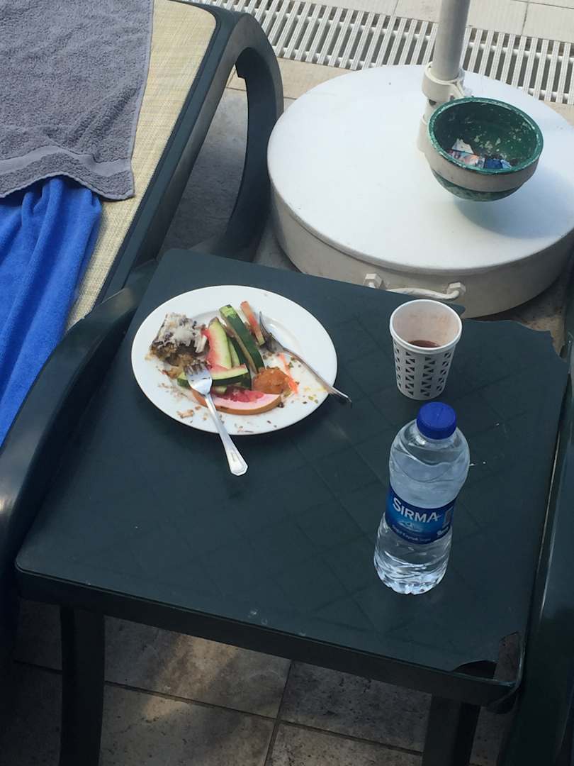 Reste vom Vortag am Pool die fast 23 Stunden unangetastet stehen blieben