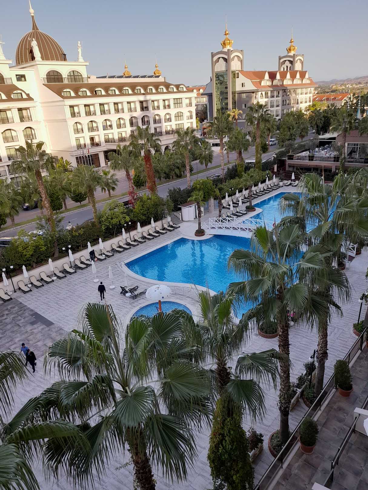 AusblickBlick von einem der Zimmer ( abends ) auf den Hauptpool , ein Nachbarhotel und ganz rechts sieht man die große Terrasse der Lobbybar