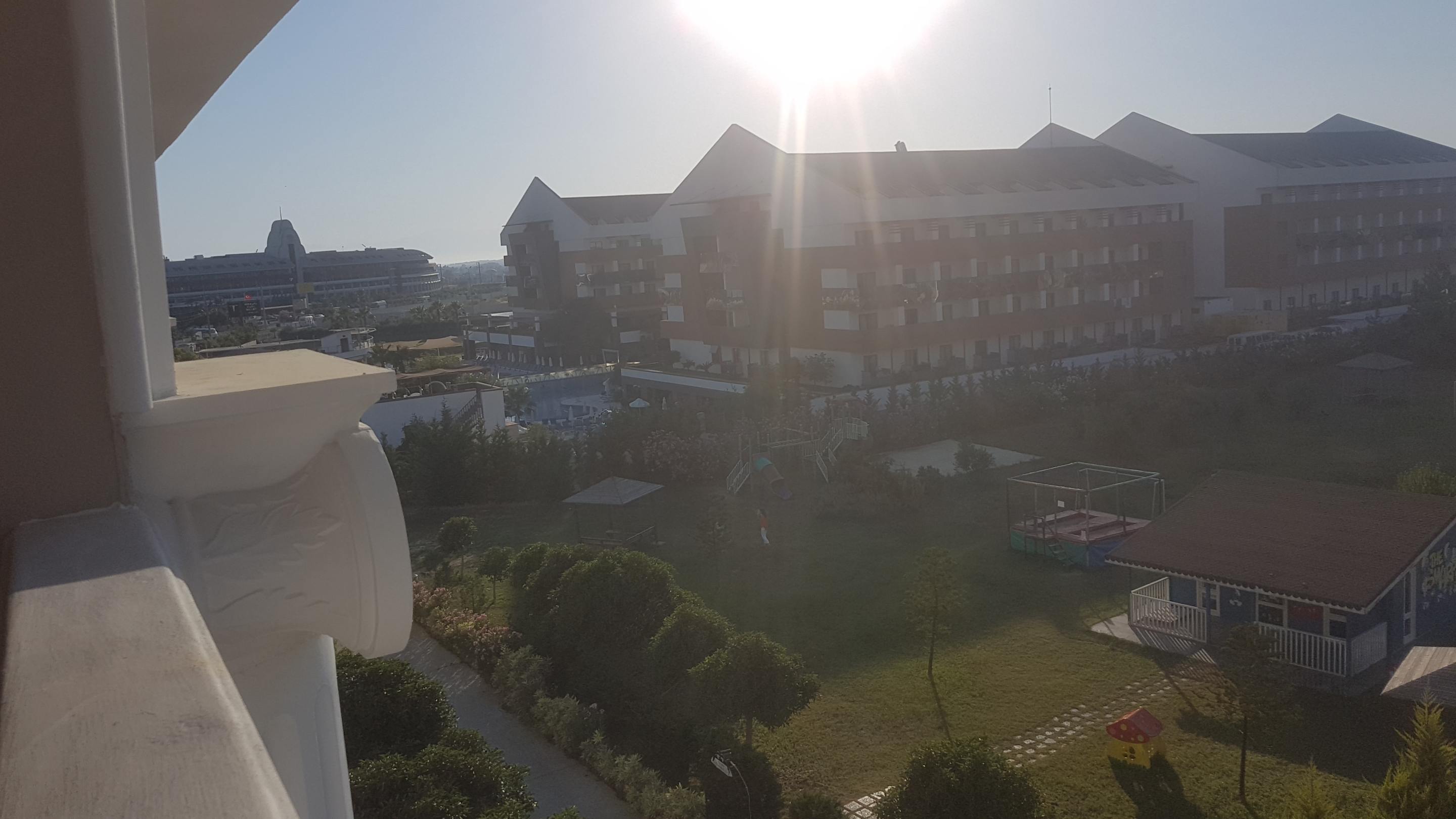 Ausblick vom Balkon auf den Miniclub und dem Spielplatz und Trampolin