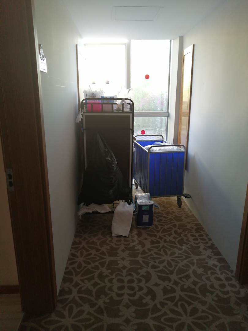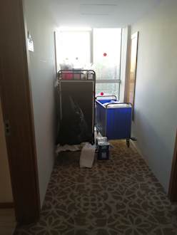 SonstigesIm Flur stand der Wagen des Putzpersonals mit dreckigen Handtüchern und vollem Müllsack.