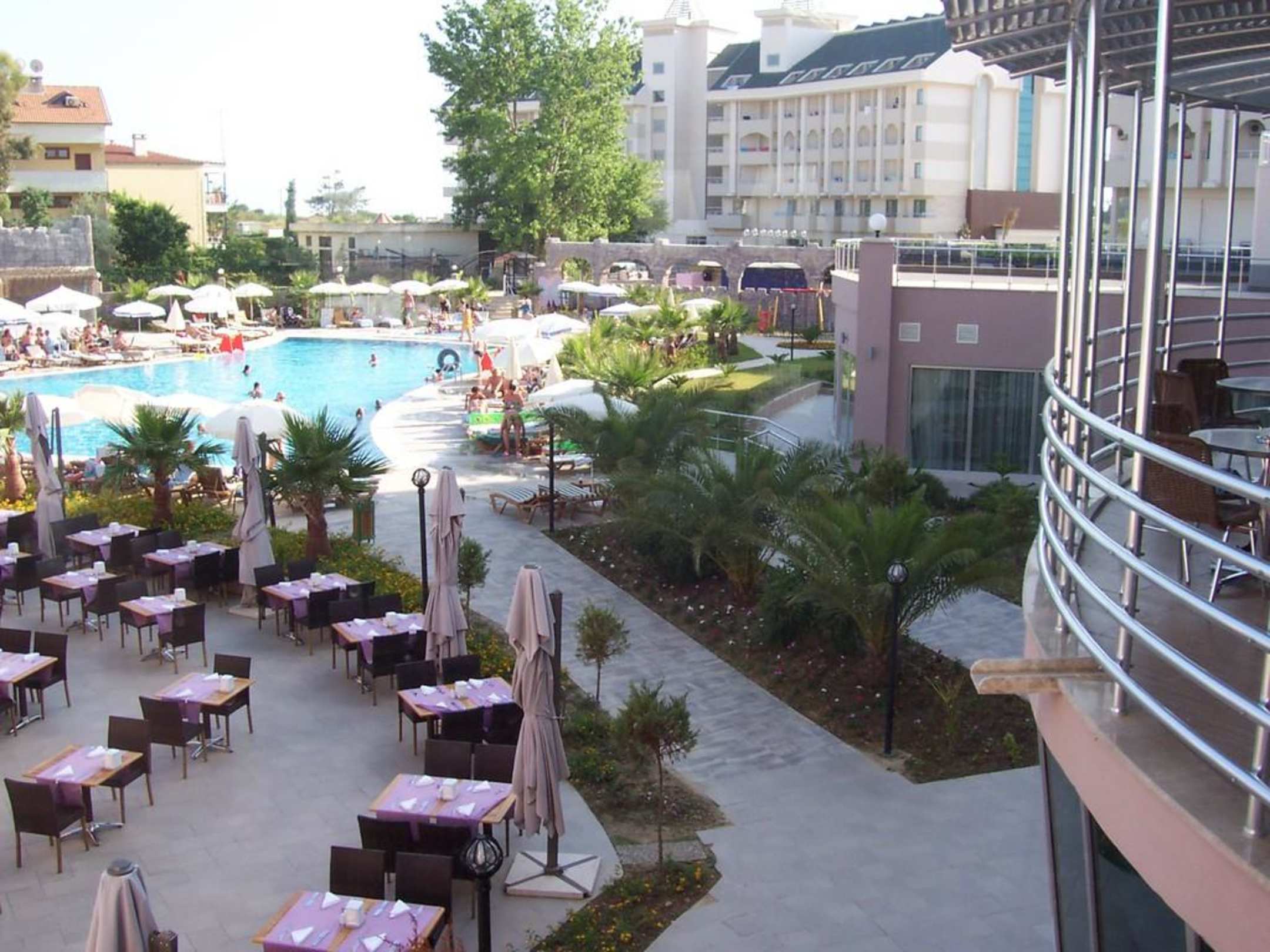 Blick von der Lobbybar auf Poolanlage und Restaurant (vorne links)