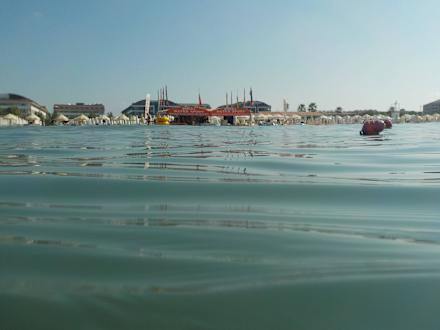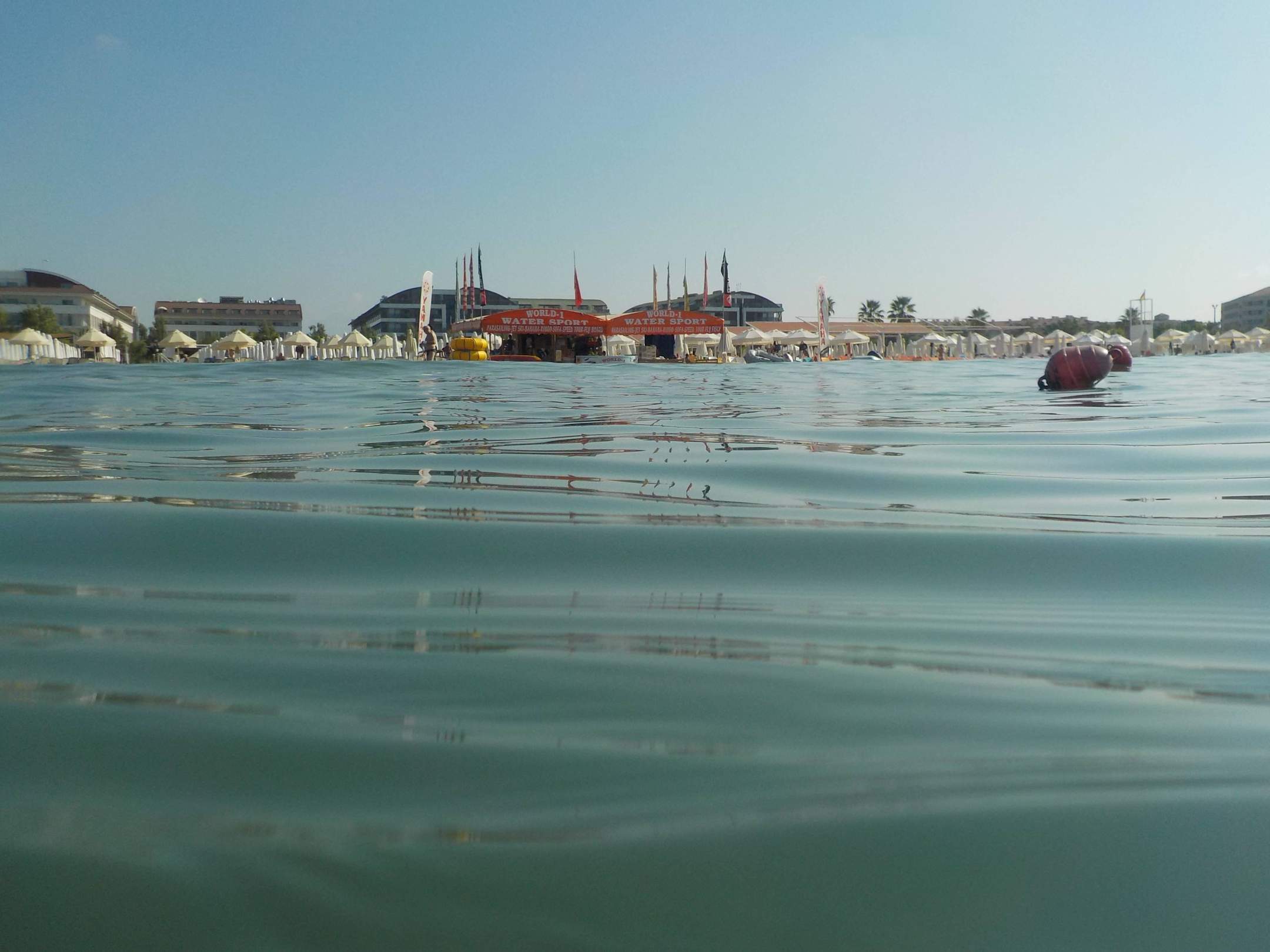Blick aus dem Wasser zum Hotelstrand