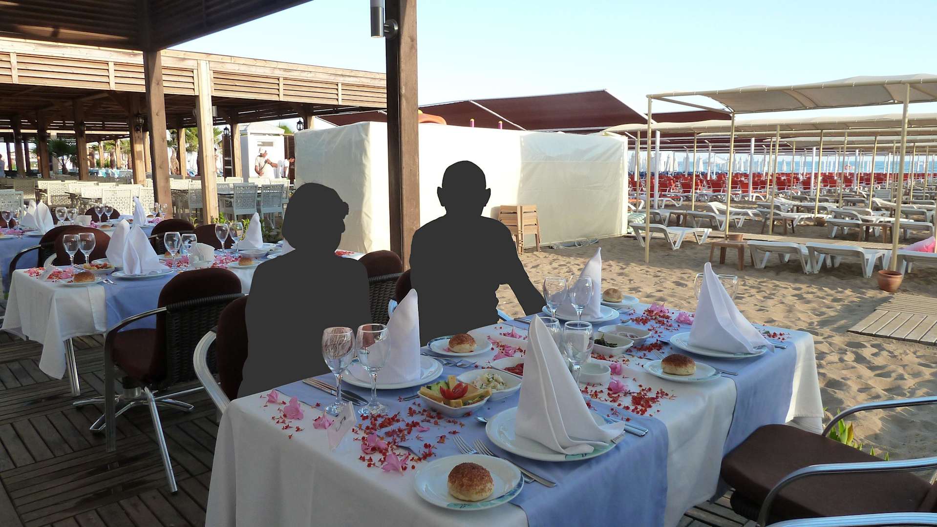 Die Strandbar am Abend - Tische festlich gedeckt für das "A la Carte" Essen.