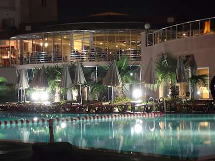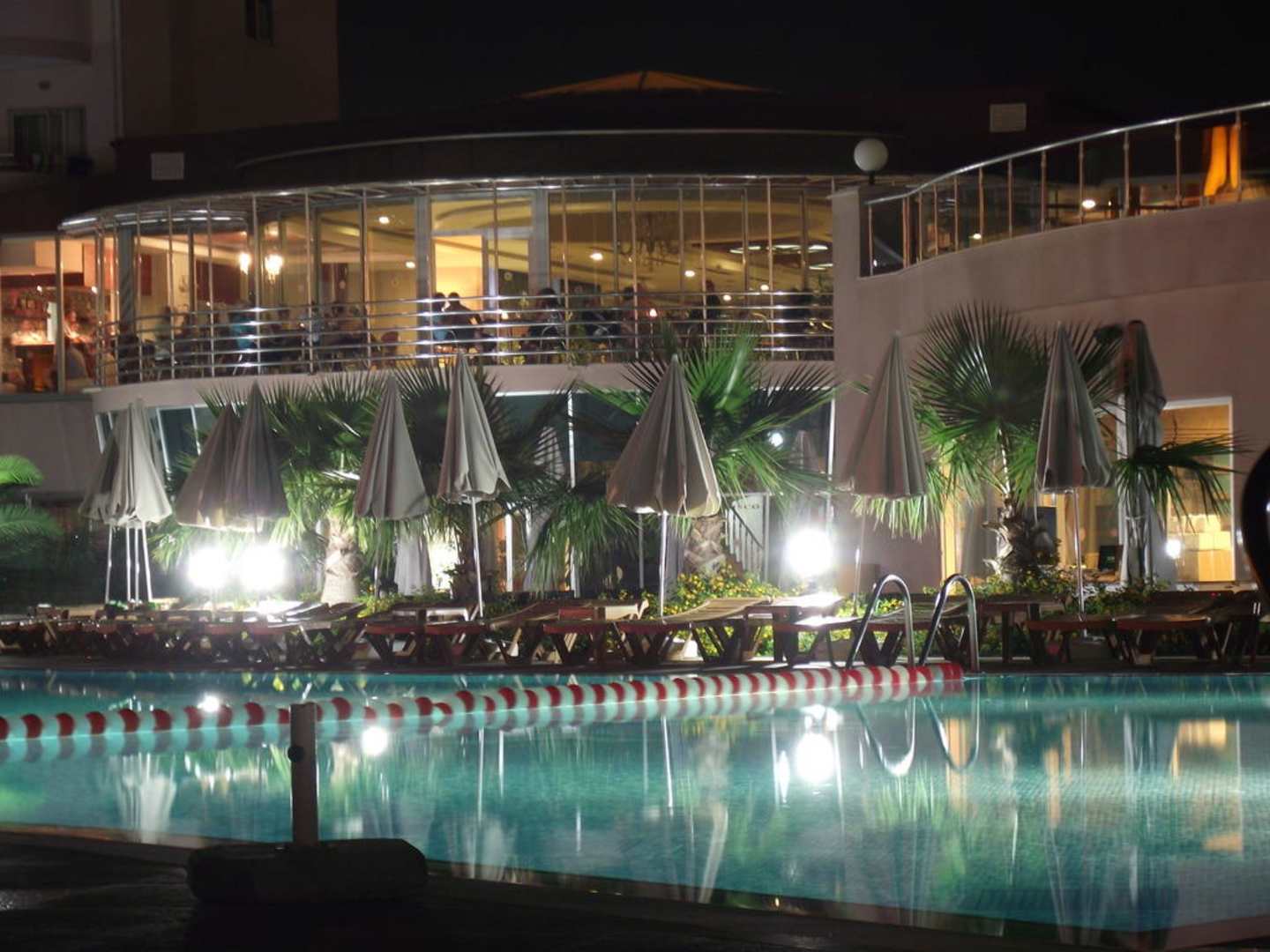 Blick über den Pool auf den Lobbybalkon bei Nacht