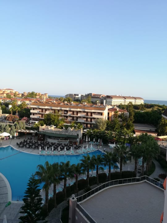 Aussicht von Balkon auf Pool und Meer