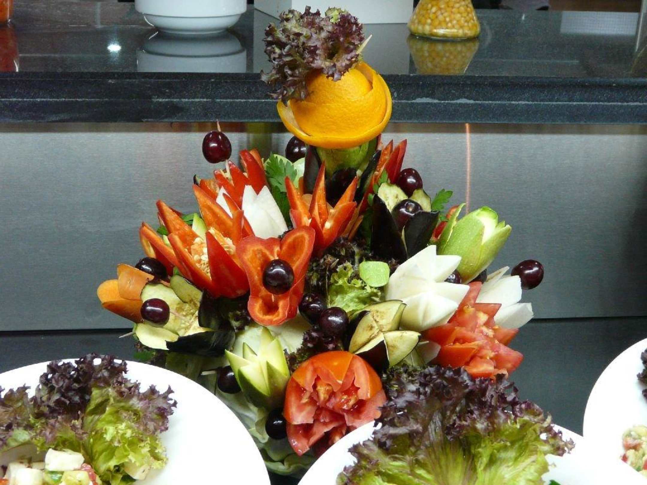 Ein Kunstwerk aus Paprika, Gurken, Tomaten und Oliven