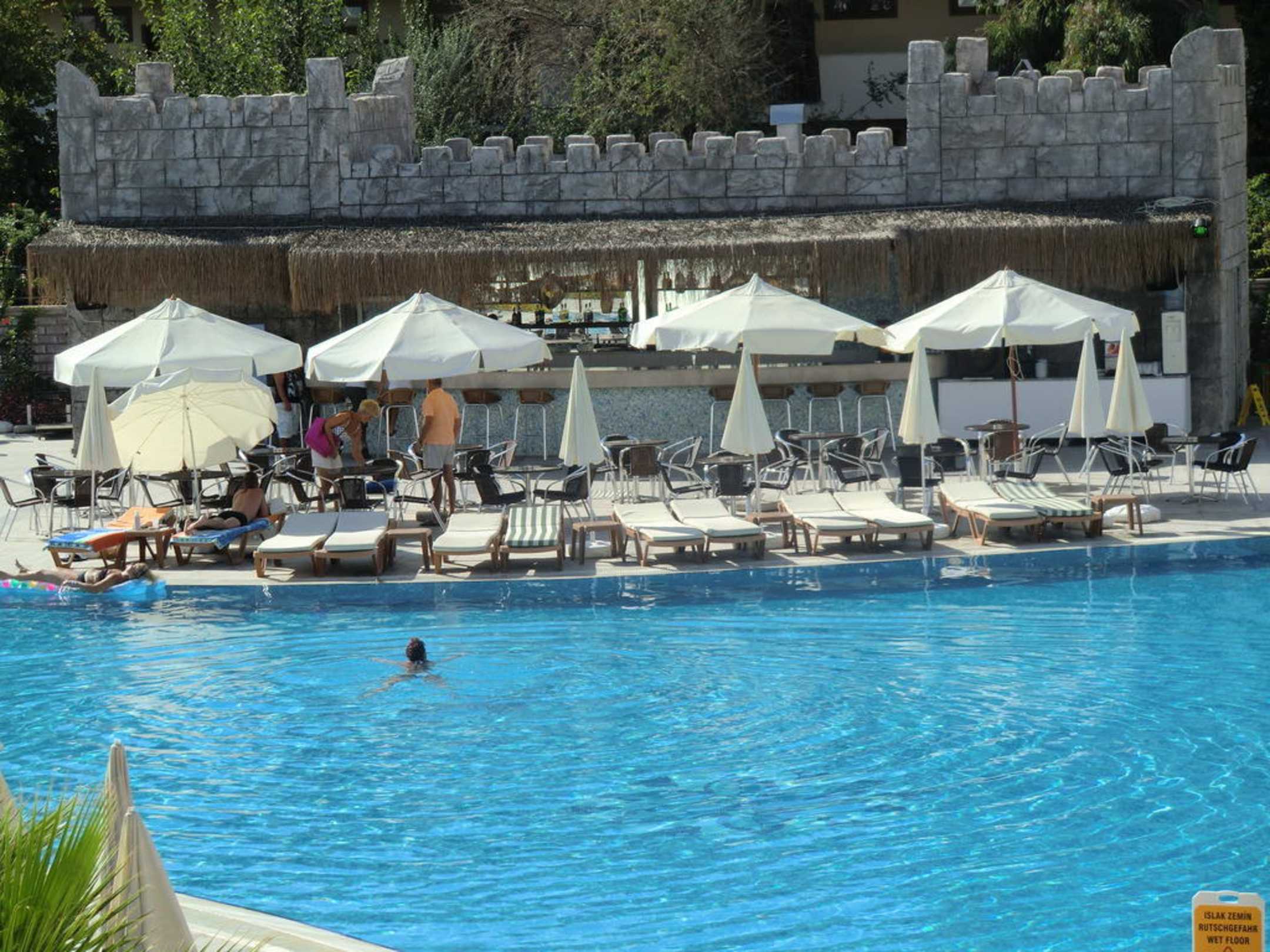 Blick auf den Pool unddie dahinter liegende Poolbar