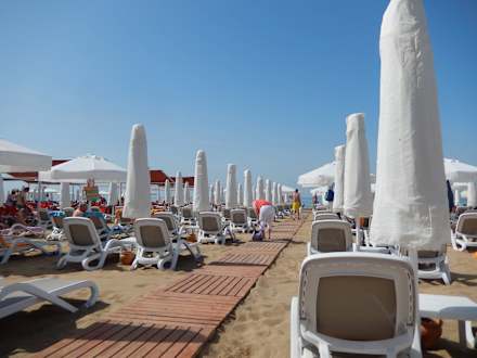 Kostenlose Liegen und Schirm, wird ständig sauber gehalten. Mit Strandbar für Getränke und Mittagssnacks. Duschen, WC und Umkleidekabine vorhanden und auch sauber.