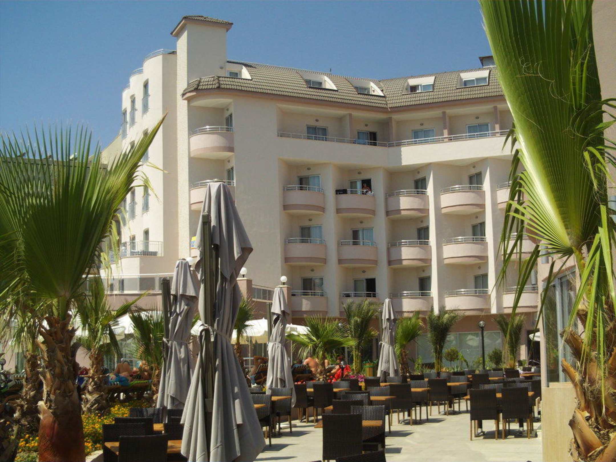Sicht vom Liegestuhl aufs Hotel