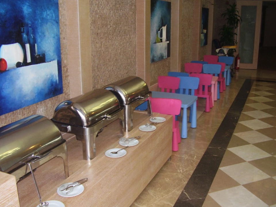 Auch die kleinen Gäste können bequem an die Kostbarkeiten kommen. Die Anrichte und Bestuhlung liegt tiefer und auch Geschirr und Besteck sind aus ungefährlichem Kunststoff und mit Kindermotiven bemahlt.