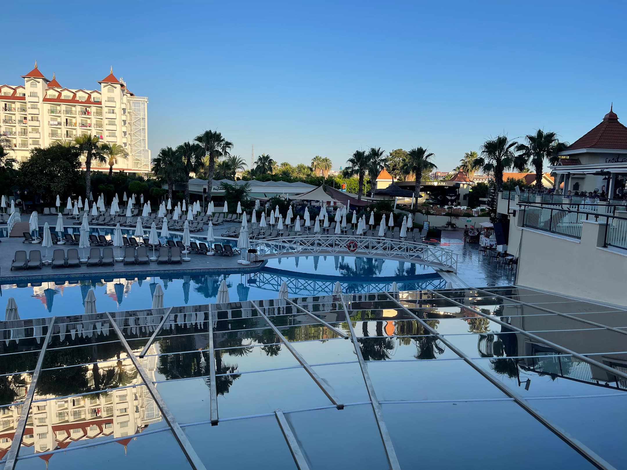 PoolBlick vom Relaxpool auf Hauptpool, Snackbar und Show Arena