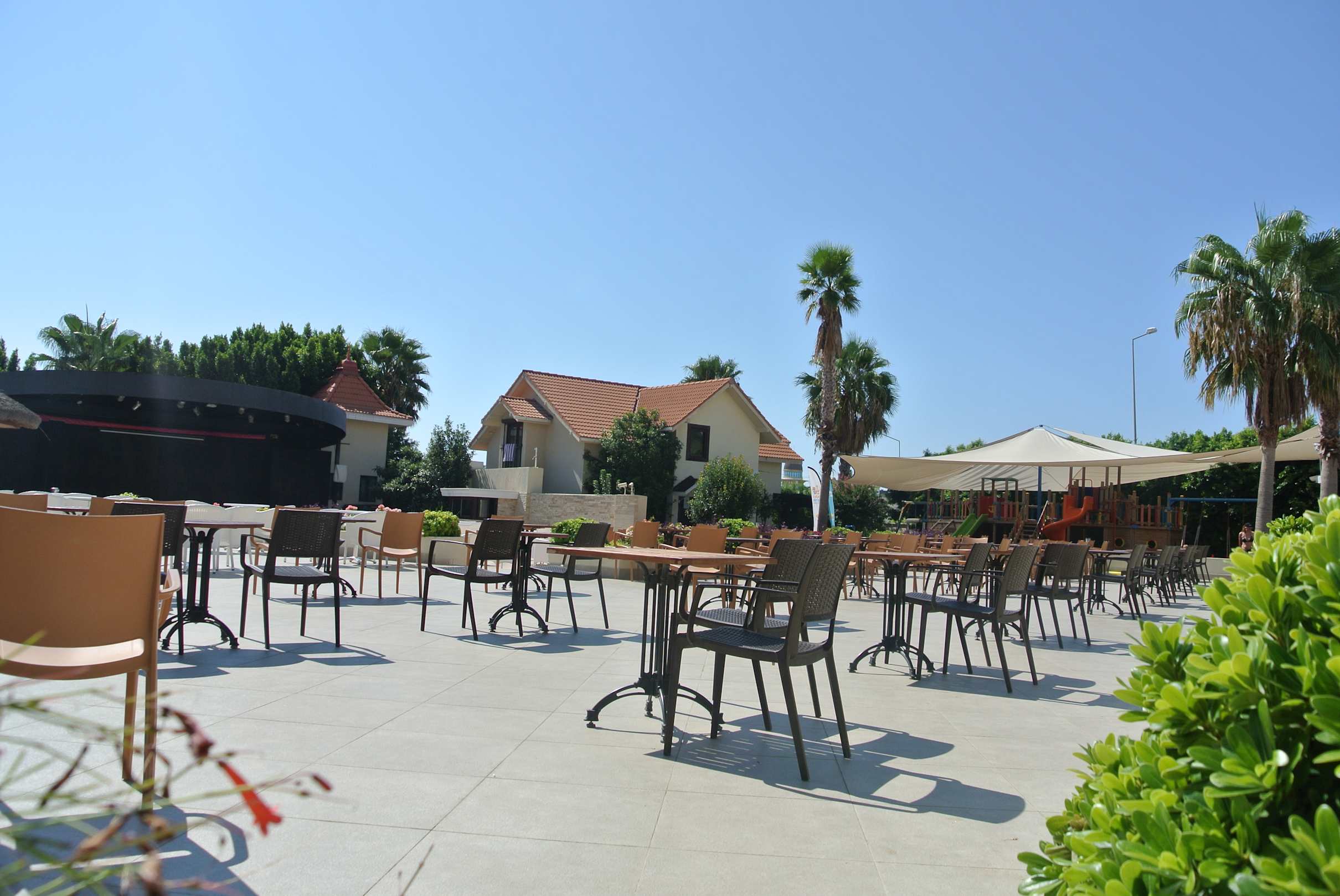 Links die Bühne für die Shows, rechts hinten der überdachte Kinderspielplatz