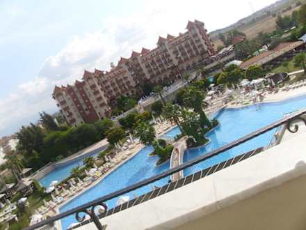 Blick zur Poolanlag und zum Side Mare AquaDas Hotel gegenüber ist dann am 13.10. nachts abgebrannt... war leider nicht so schön das mit anzusehen, stelle noch ein Video rein.... nachts liefen dort dann immer Plünderer mit Taschenlampen um sich noch was aus dem Hotel zu holen.