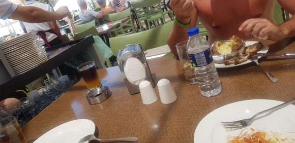 Während man isst,wir am Nachbartisch mit viel Krach die Teller weggeräumt und die Reste in Mülltüte entsorgt,statt sowas in der Abräumstation zu machen!!!!Ekelhaft!!!!Ein No go!!!