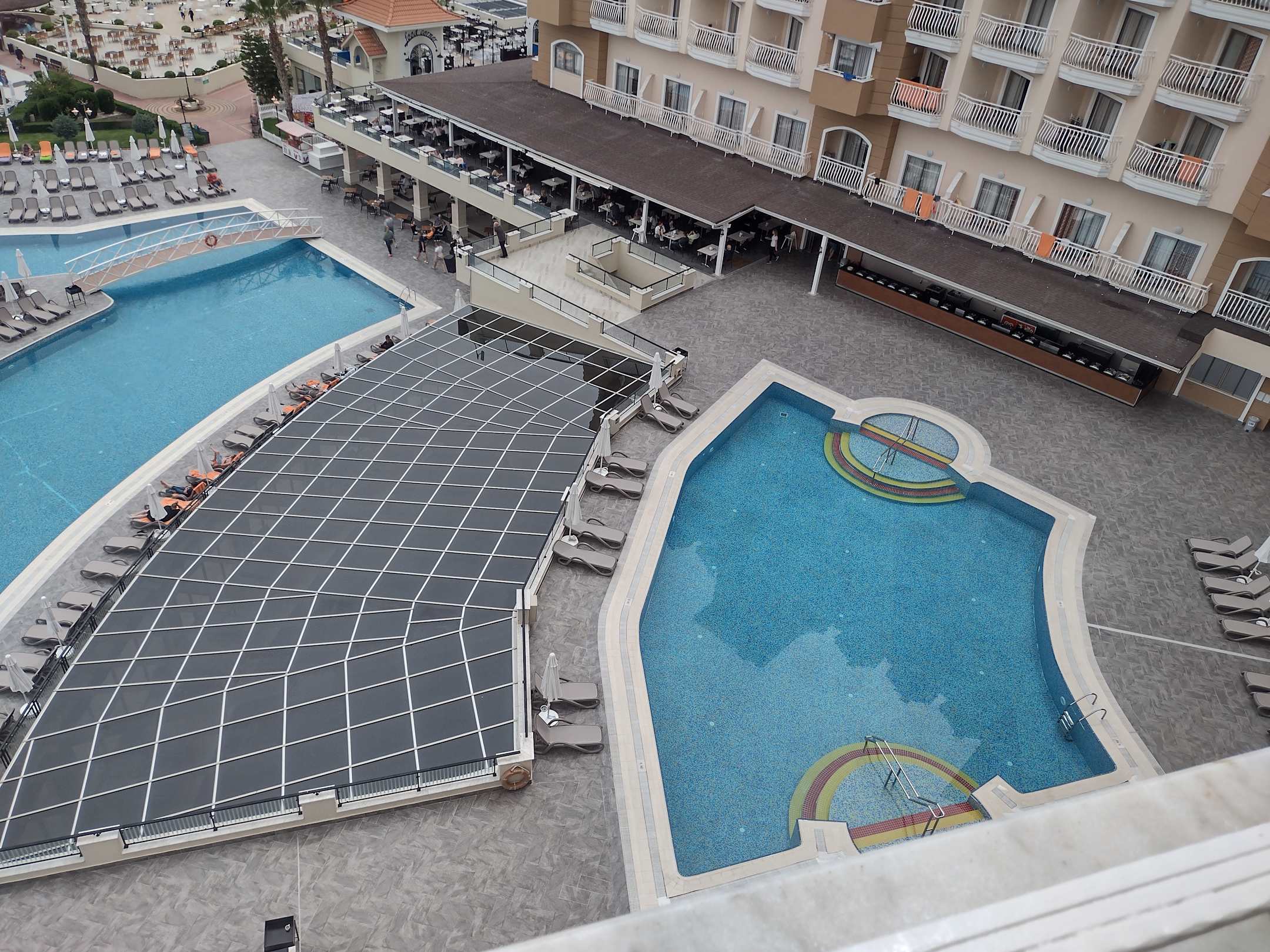 AusblickBlick vom Balkon, links großer Pool, mittig Restaurant, unter dem Dach Hallenbad, rechts kleiner Pool