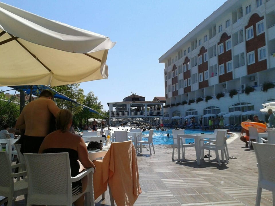 Die großzügige Sitzfläche. Man kann unter großen Sonnenschirmen sitzen und sich so zum teil vor der Sonne schützen und ein kühles Getränk genießen.