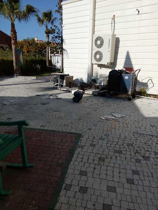 Das ist der Weg zum Spielplatz. Bauabfälle ,kaputte und geschnittene Fliesen vom Lobby Bar umbau. Alte Tische und alte Sonnenschirm Ständer. Totale Verletzungsgefahr nicht nur für Kinder.