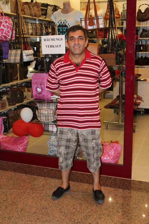Sramm steht Mitcho vor seinem Ledergeschäft im Hotel Club Hane
