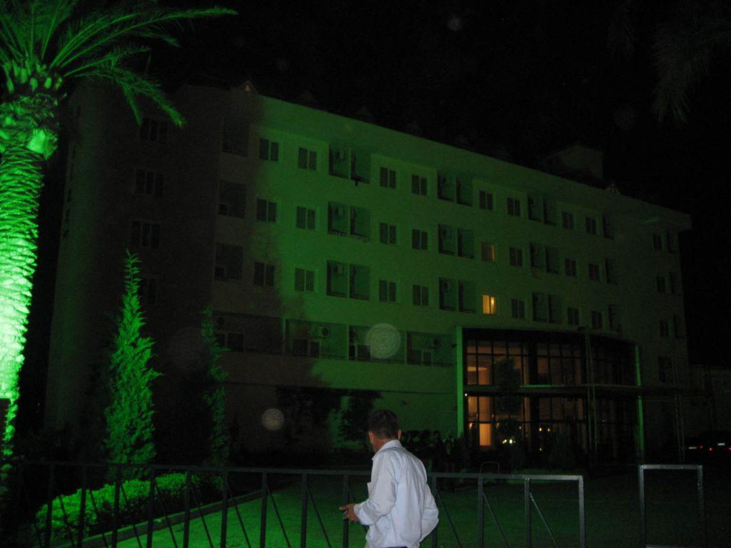 Beleuchtete Hotelfront bei Nacht