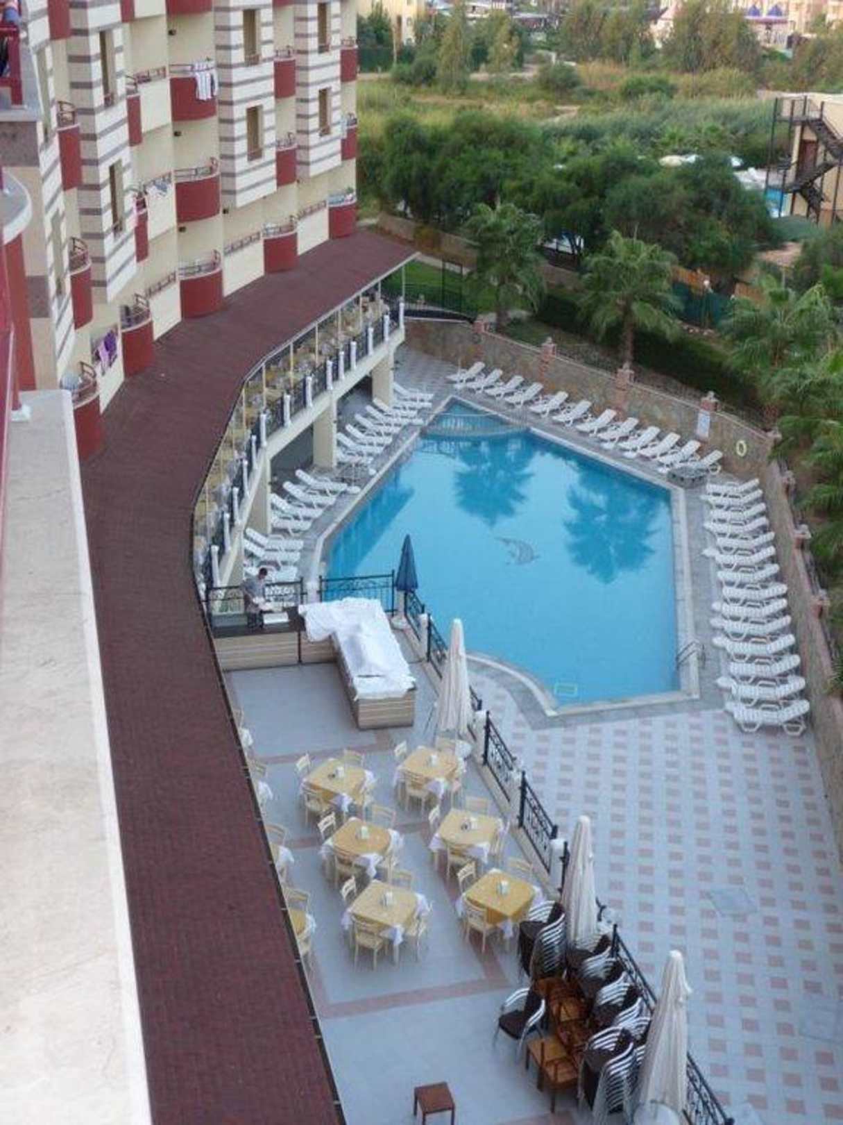 Blick auf die Anlage (Club Hane)vom Balkon (Zimmer 402) sind der Pool und ein Teil des Essbereiches des Club Hane zu sehen