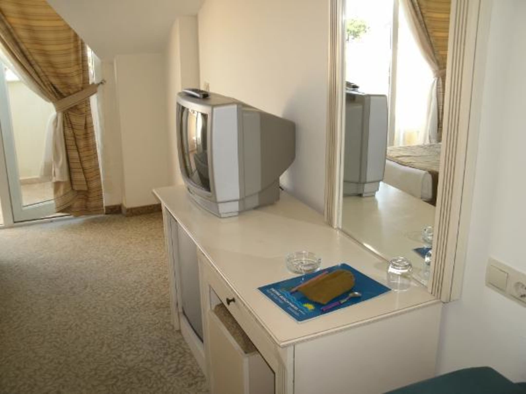 Perspektive von der ZimmertürMan sieht den Fernseher,unter dem Fernsehr befindet sich die Minibar.