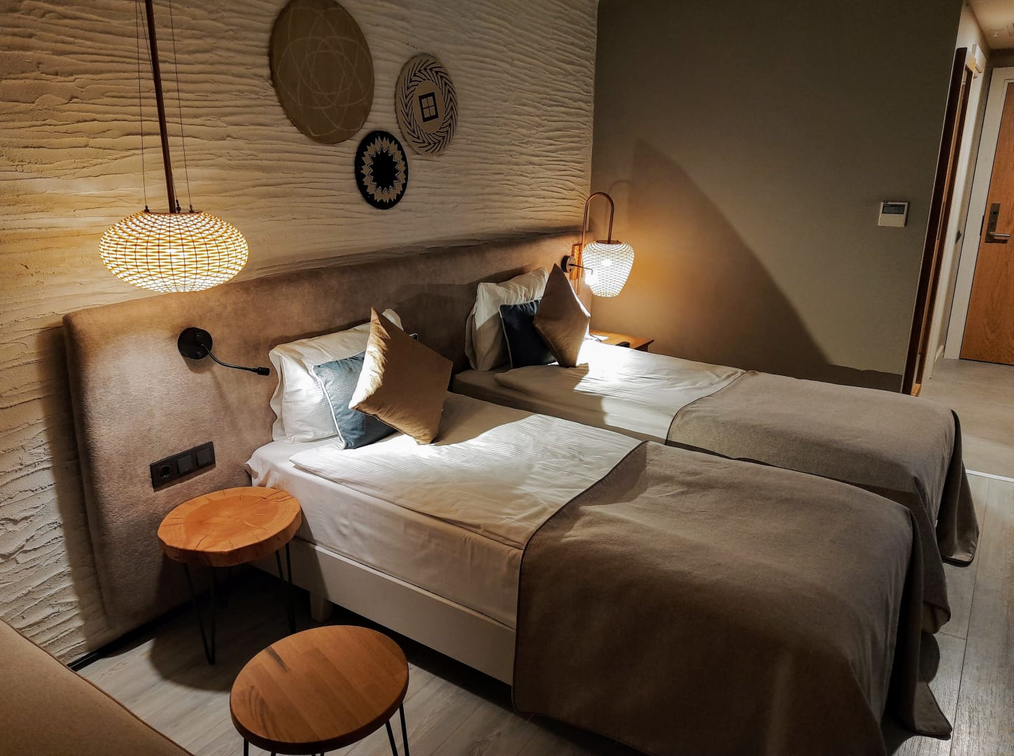 Standard-Doppelzimmer mit getrennten Betten und Blick auf den Pool...