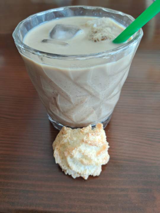 Eiskaffee mit Makrone aus dem Coffeeshop