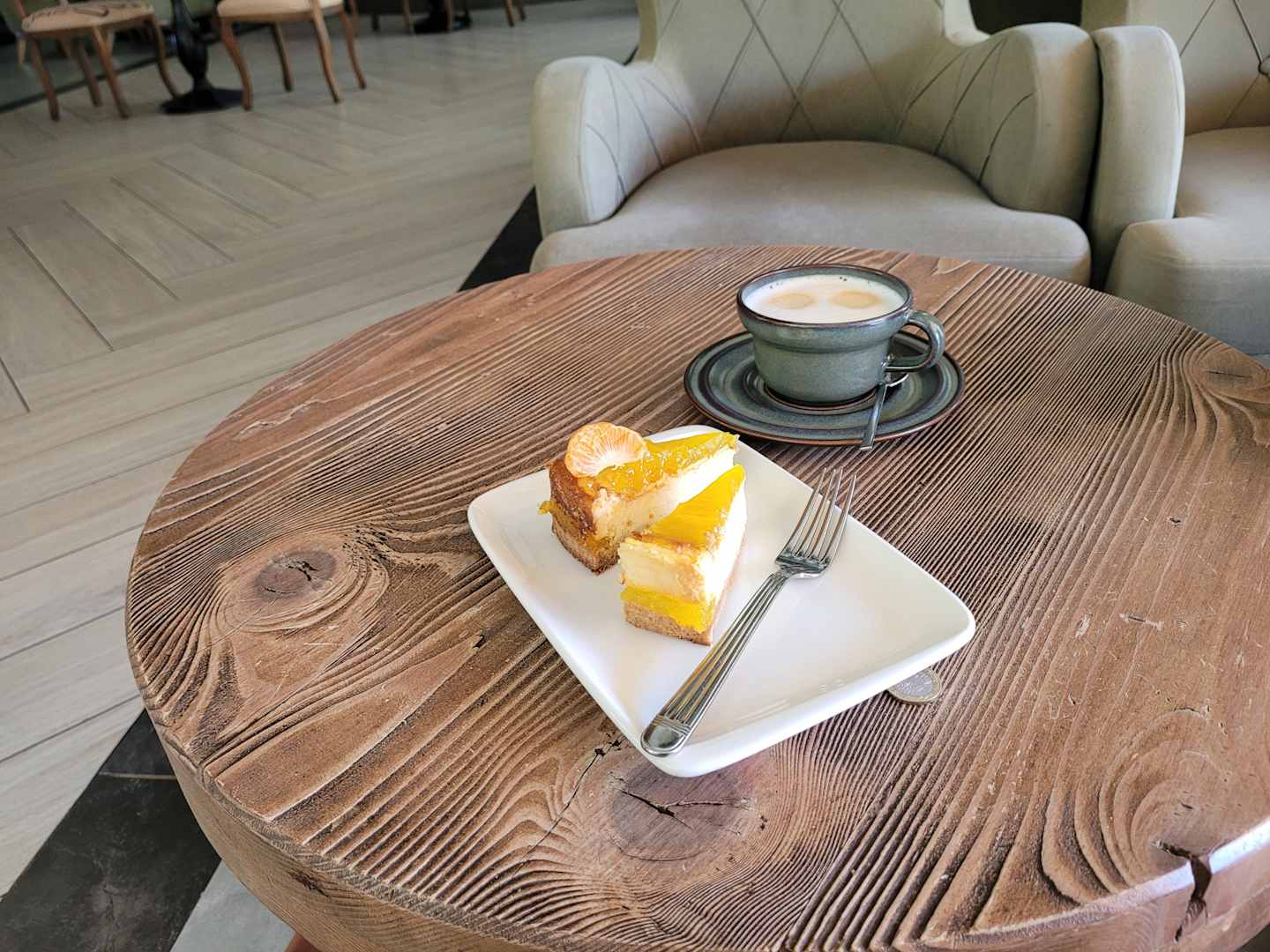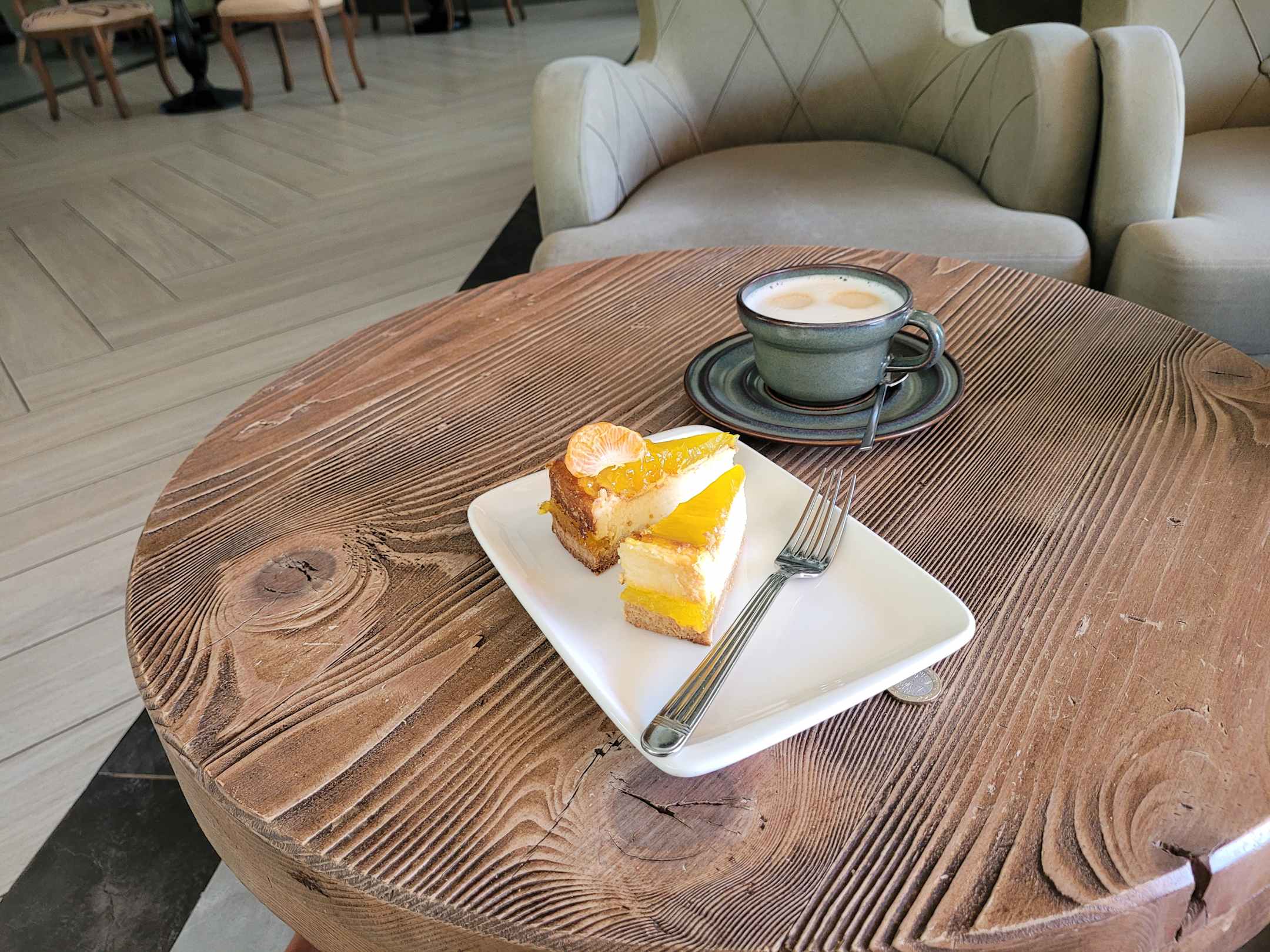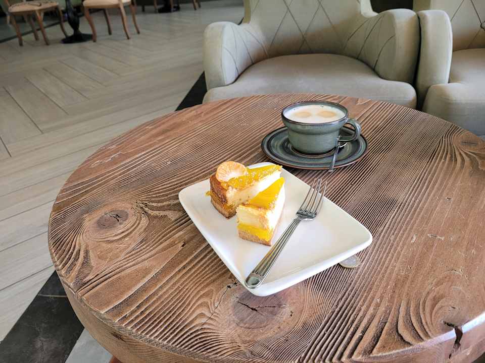 Käsekuchen und Latte sehr lecker im Coffeshop