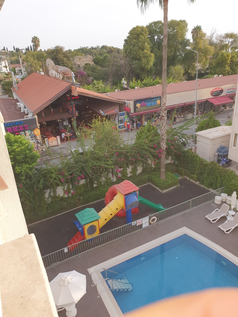 Ausblick vom Balkon. Links neben dem Hotel Shopping Möglichkeit unten kleine kinderpool