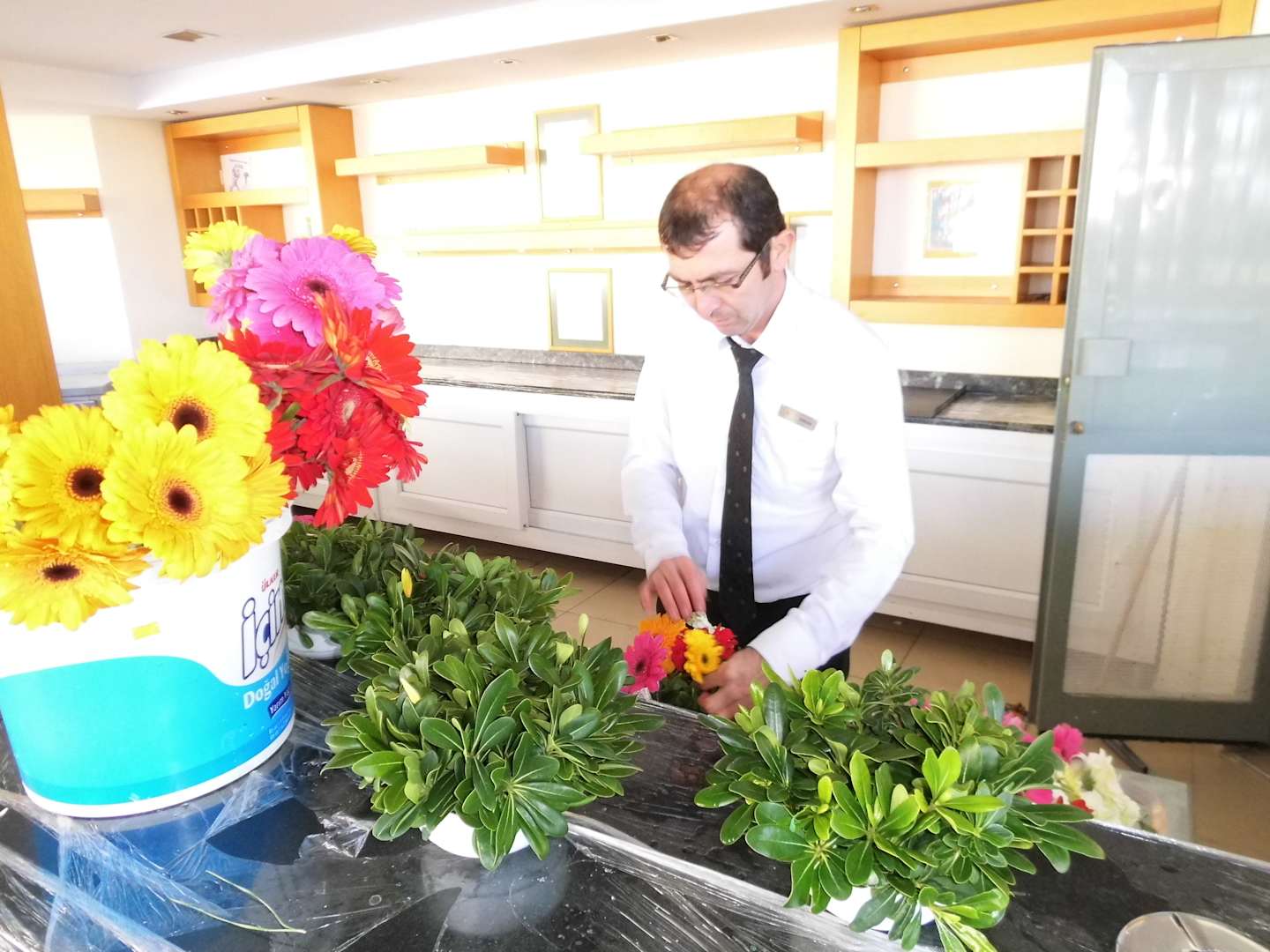 Erkan als vielbeschäftigter Florist muß 31 Blumengestecke für den Empfang am 24.Dezember mit vorbereiten. Wir Gäste waren überrascht von der "Fremdarbeit".