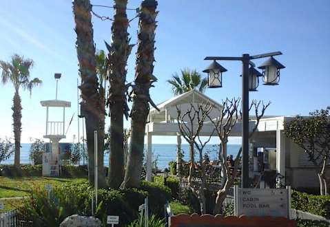 Blick vom Garten zur Promenade und Beachbar