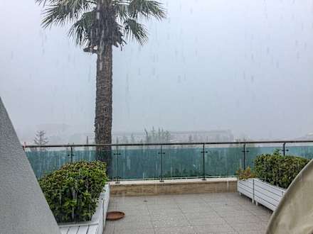 Blick von der Terrasse auf die verregnete Umgebung