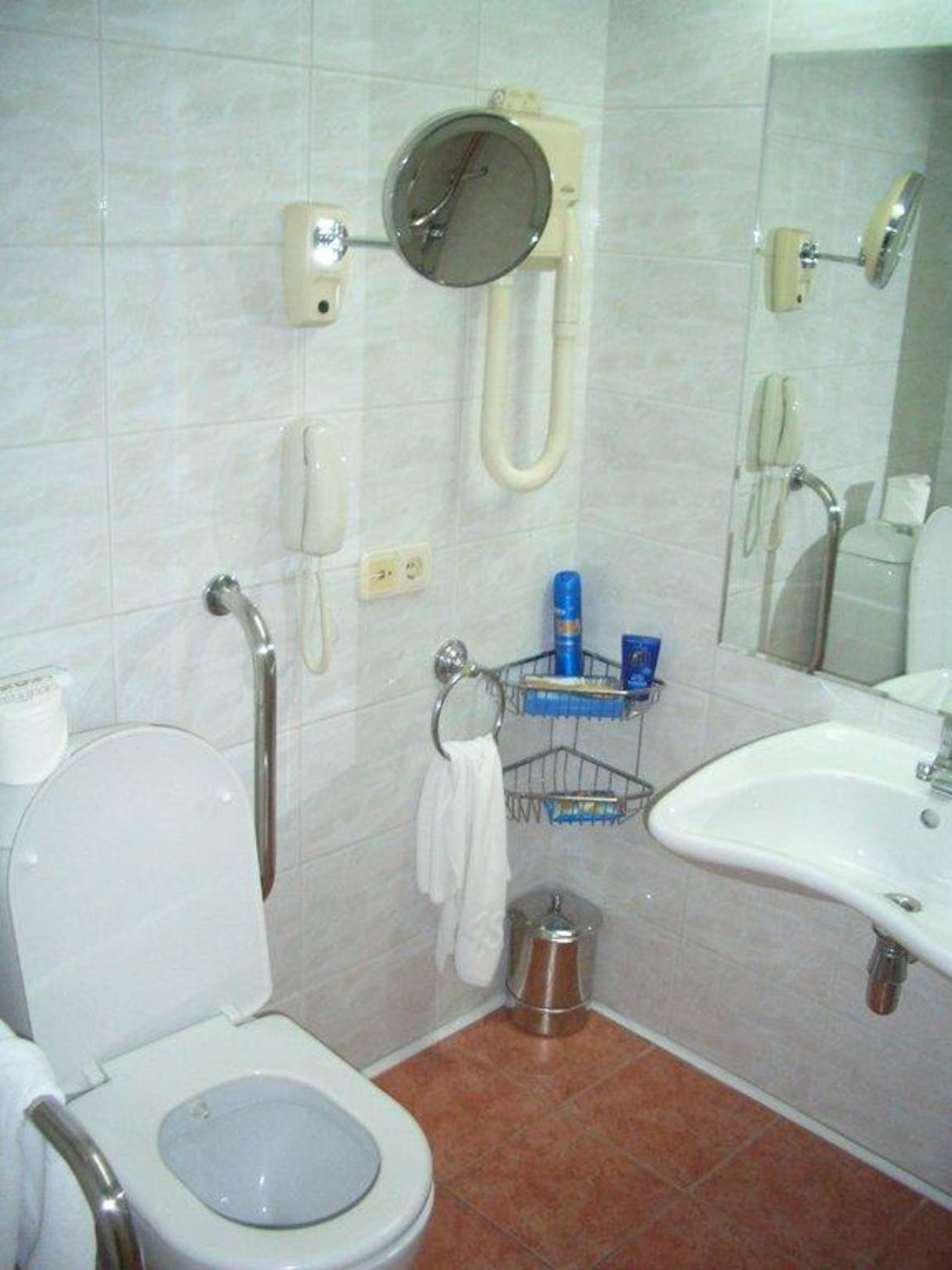 Links unten im Bild sieht man den Haltegriff für die Toilette und am Waschbecken ist eine Wölbung damit man mit dem Rollstuhl drunter fahren kann.