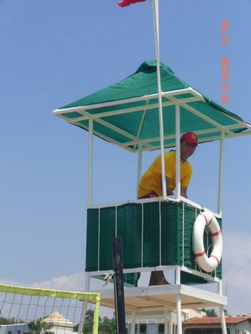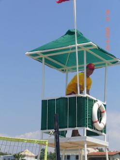 Hier ist der Beweis, dass der Strand bewacht wird. Der Lifeguard hißt beim Verlassen seines Platzes die rote Fahne, also baden auf eigene Verantwortung.